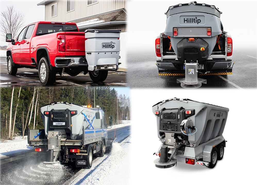 Οι πολυλειτουργικοί αλατοδιανομείς της εταιρίας Hilltip είναι σχεδιασμένοι για την εγκατάσταση UTV, pick—up και φορτηγό. Η χοάνη είναι κατασκευασμένη από πολυαιθυλένιο και επιπλέον περιλαμβάνει δεξαμενή για την προαιρετική προ-ύγρανση του συστήματος. Επιπλέον, είναι εύκολοι στην χρήση τους από τα εργονομικά χειριστήρια μέσα στην καμπίνα.